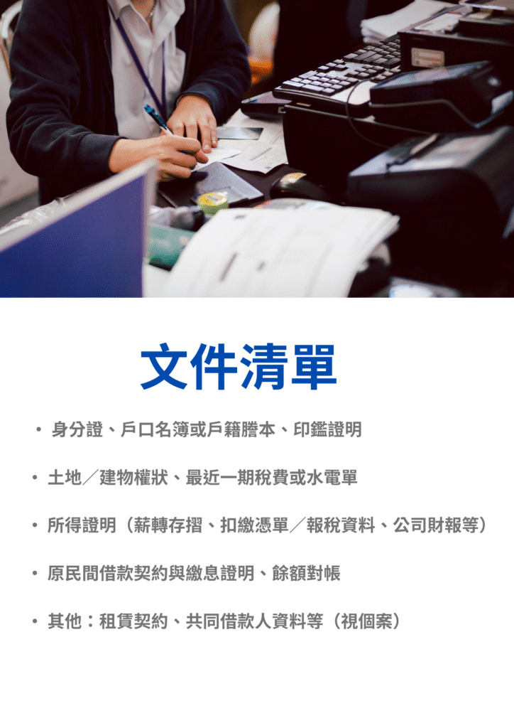 申請貸款時,通常需要提供身分證明、收入證明、住址證明等基本資料。我們的貸款顧問會指導您準備完整資料,確保順利申辦。